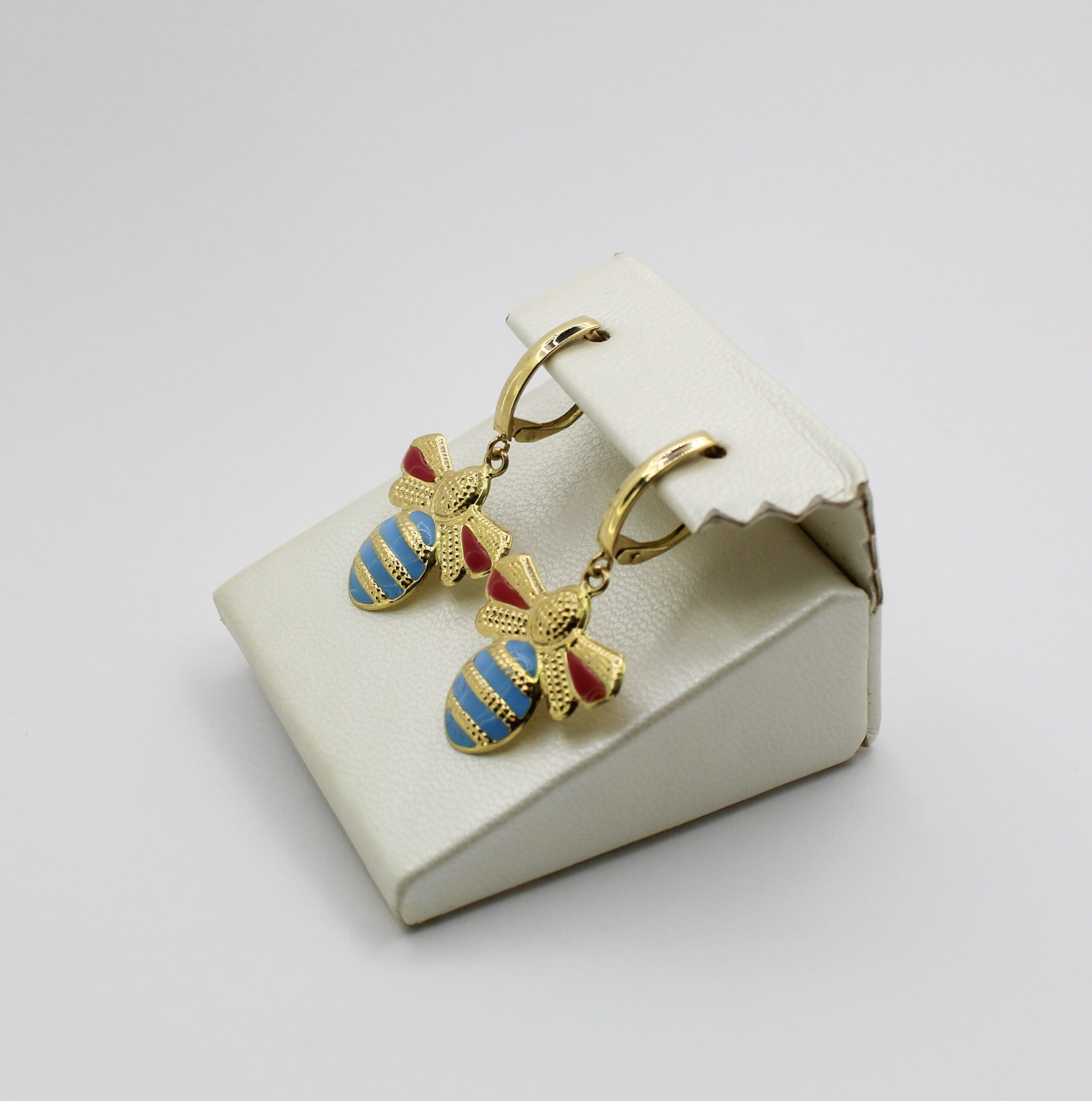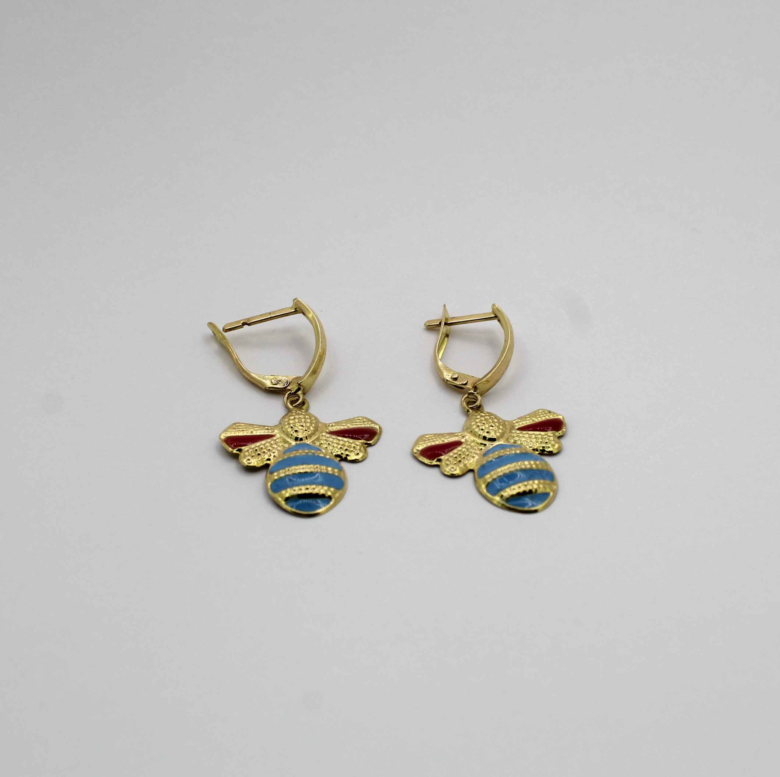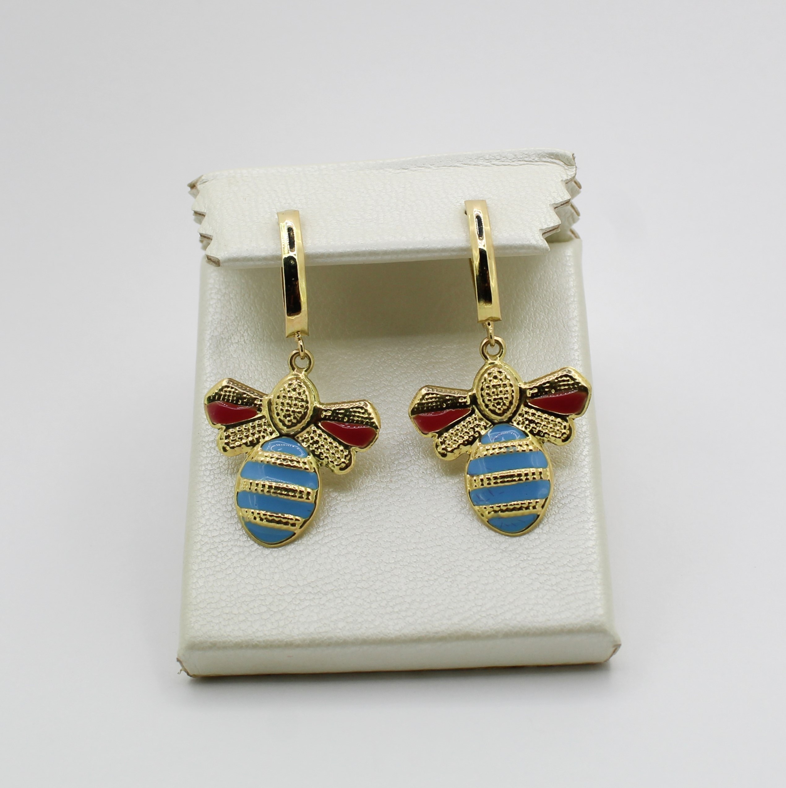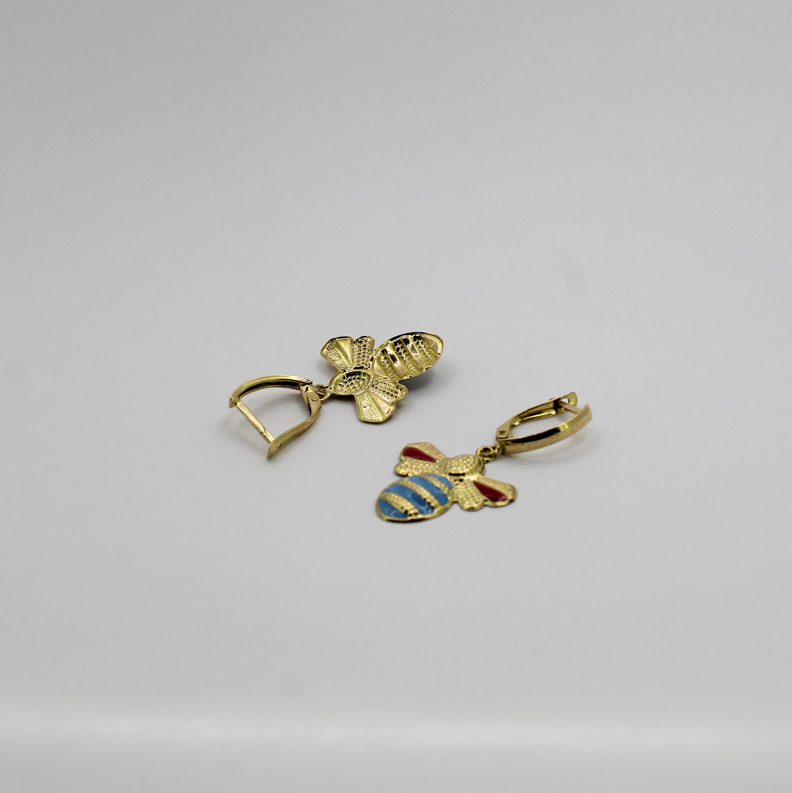 يتميز الحلق بتفاصيل دقيقة، منحوتة بعناية تبرز ملامح الجناحين والجسم، مع لمسات من المينا الملونة بدرجات الأحمر والأزرق تضيف حيوية وأناقة فريدة للقطعة.
