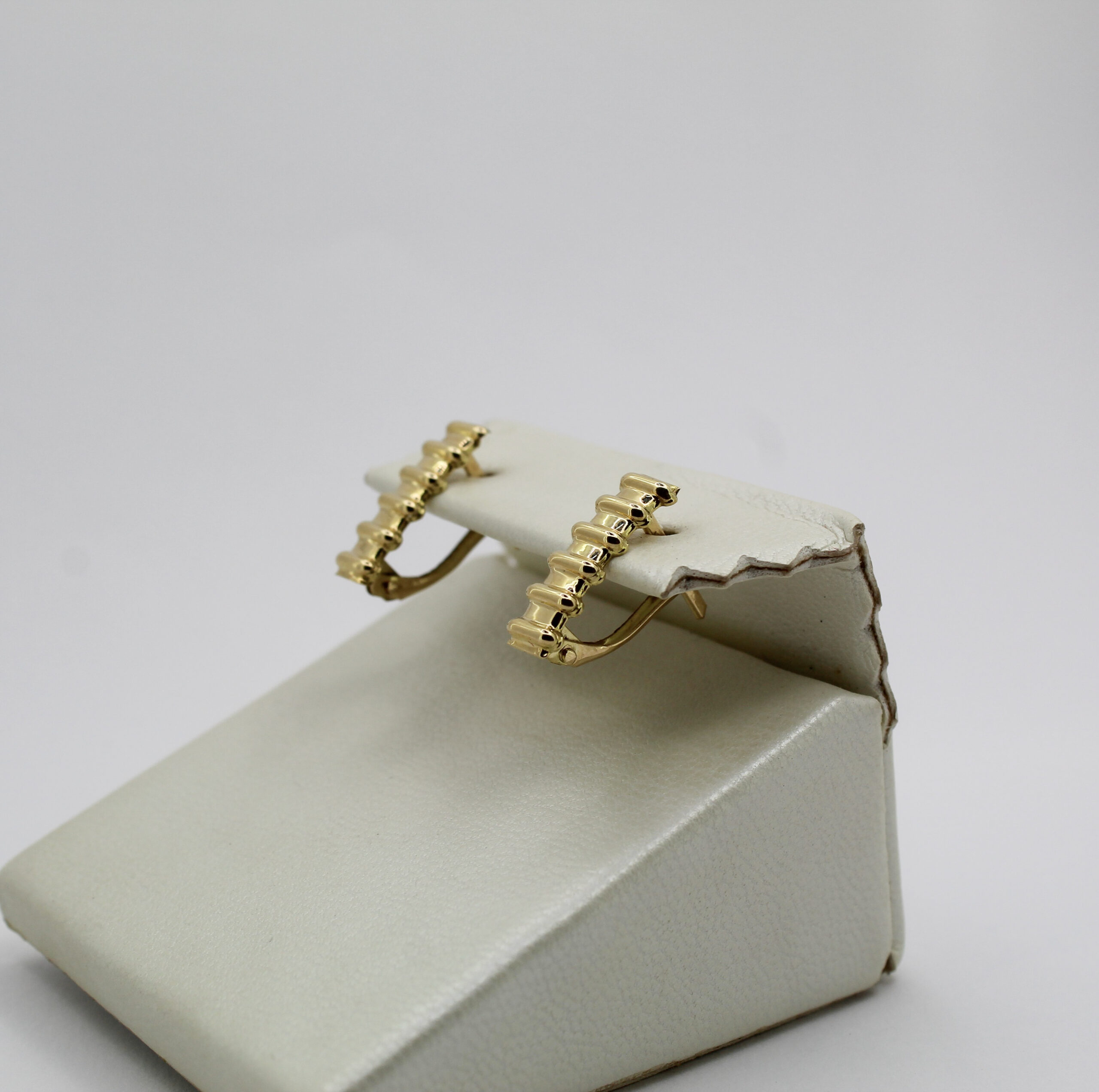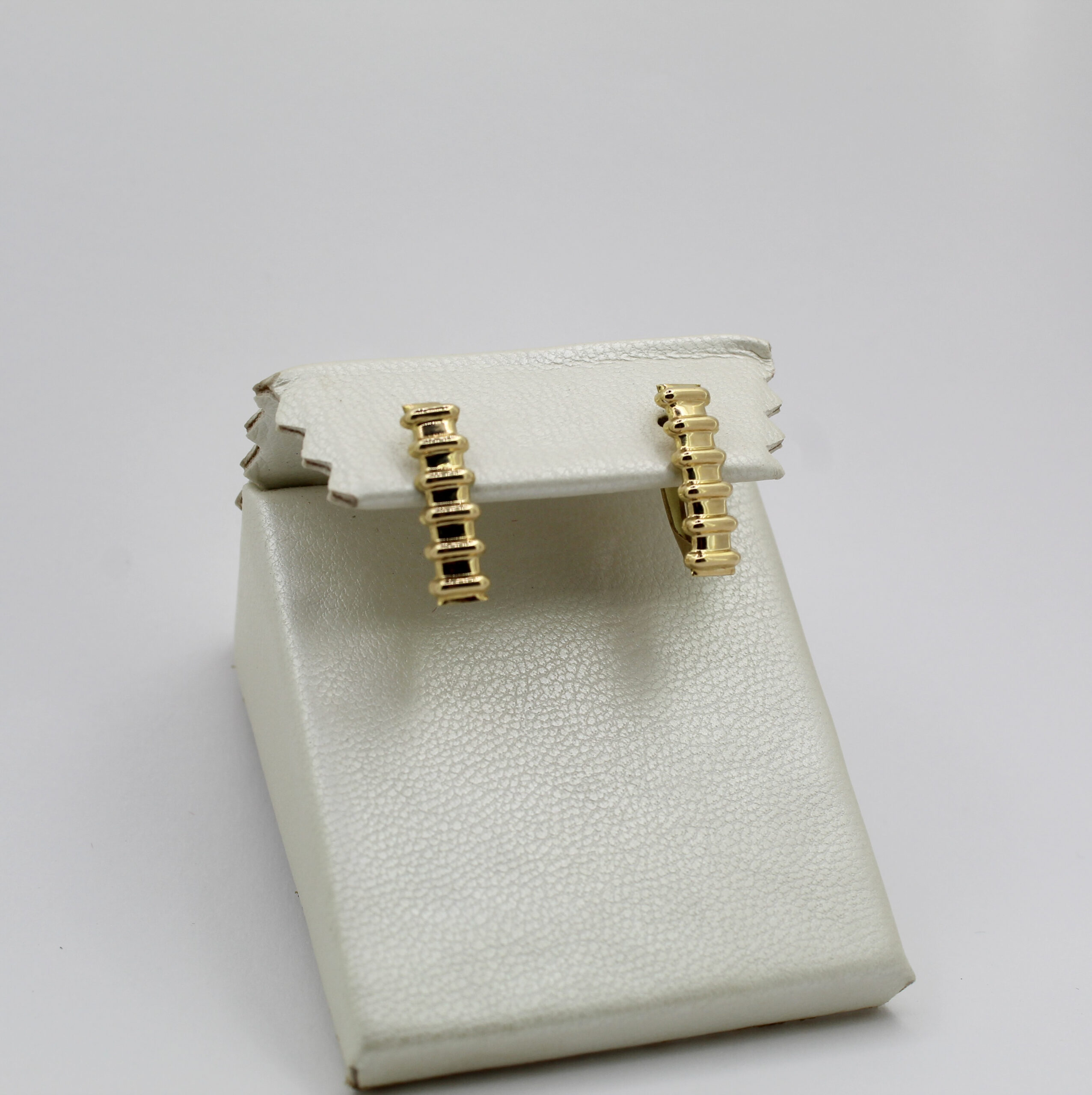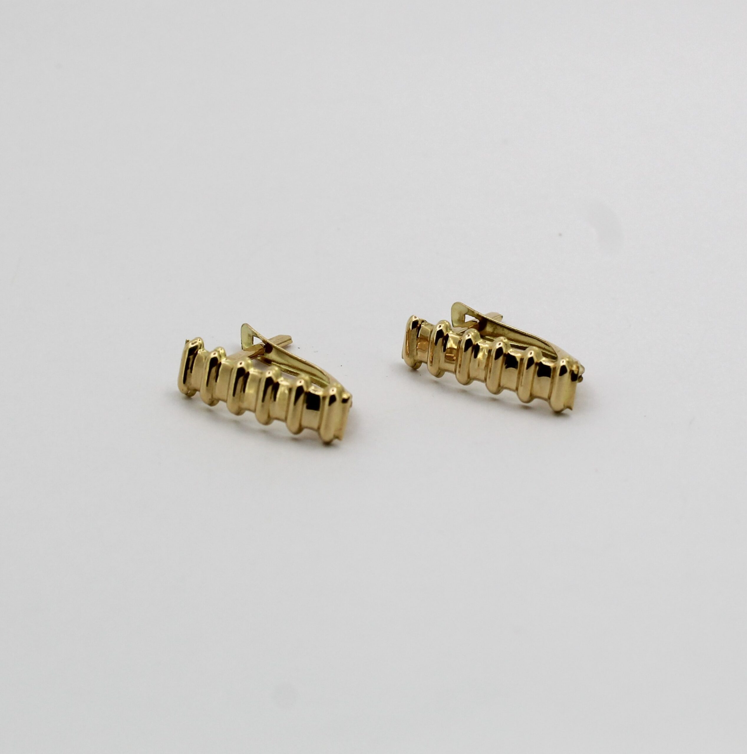 تتميّز الأقراط بتصميم عصري على شكل شرائح منسّقة تمنح لمعاناً جذاباً وأناقة هادئة تناسب المرأة التي تبحث عن قطع ذهبية فاخرة للاستعمال اليومي.