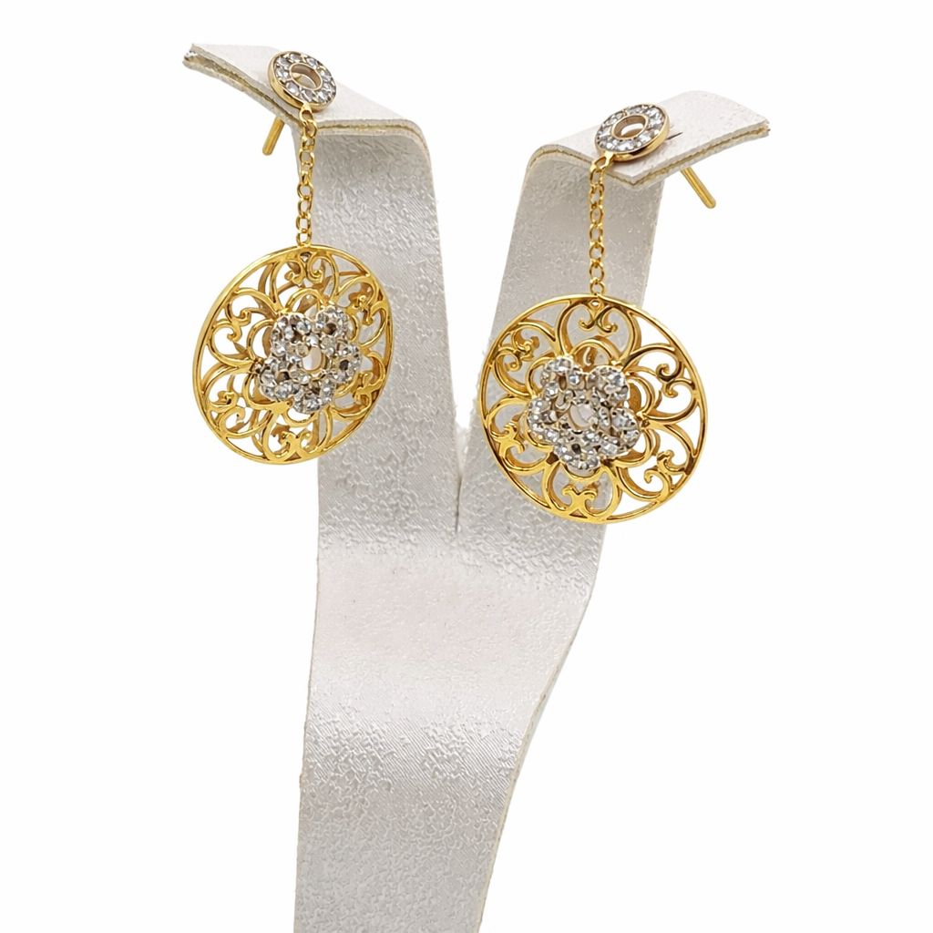 حلقات ذهب بتصميم مشبكين فاخر، تتدلّى بتناسق أنيق وتنتهي بتعليقة دائرية مزخرفة بنقوش تخرام دقيقة. تتوسّطها وريدة مرصّعة بحبيبات لامعة تضيف بريقًا ناعمًا وتبرز جمال التفاصيل، في تصميم يجمع بين الأناقة الكلاسيكية واللمسة العصرية.