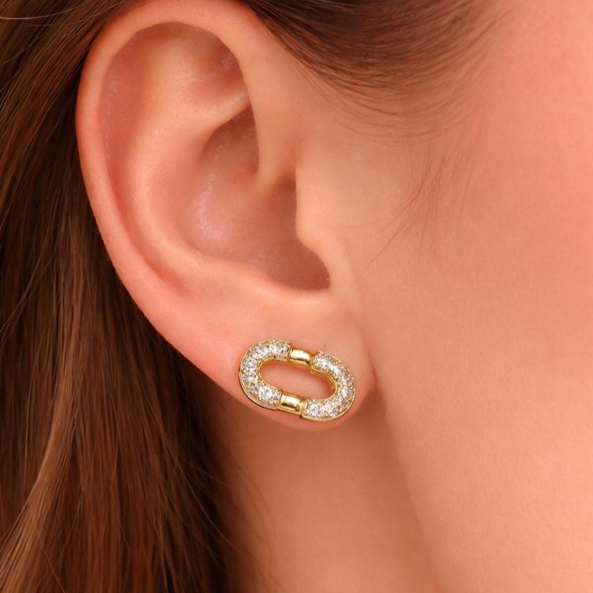 حلقات Glowy من الذهب بتصميم عصري وأنيق، مرصّعة بفصوص لامعة تعكس الضوء بإشراقة جذابة. يتميز التصميم بتوازن جميل بين الحداثة والبساطة مع لمسة فخامة ناعمة تبرز جمال القطعة.