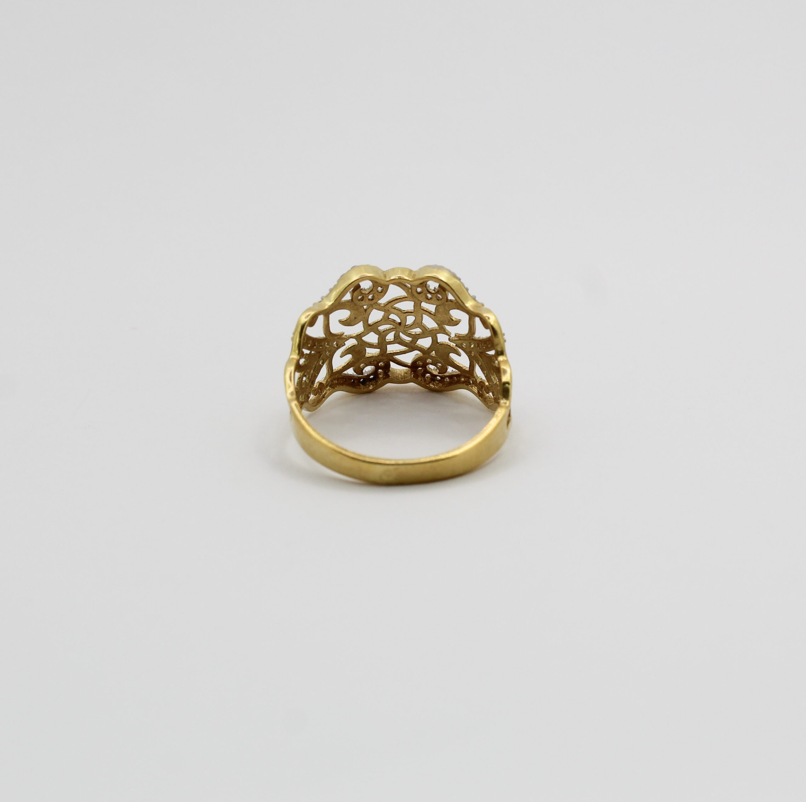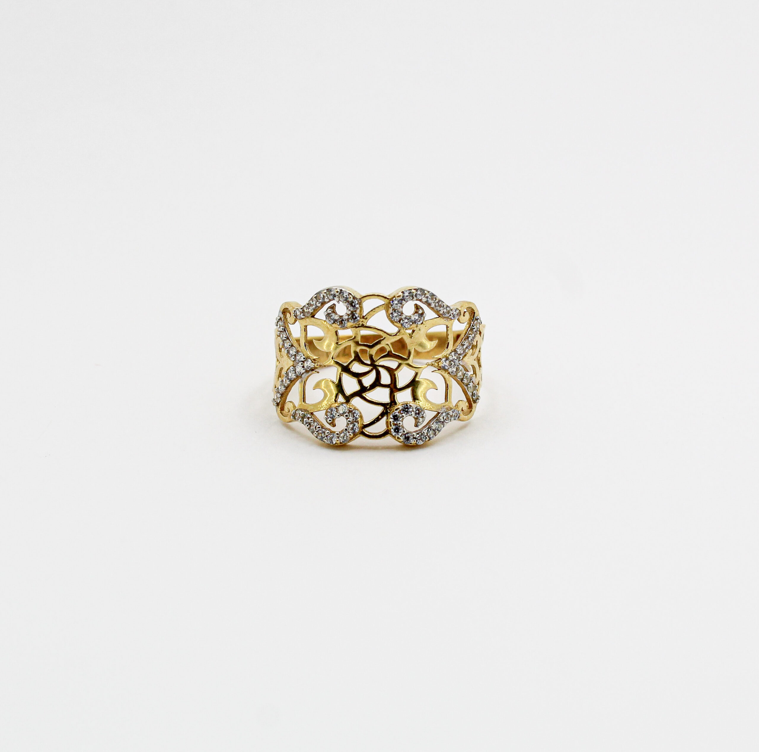 تُحيط بالخاتم خطوط منحنية مرصعة بأحجار لامعة دقيقة تضيف لمسة براقة متناسقة دون أن تطغى على التصميم الأصلي. في وسط الخاتم، يظهر نمط هندسي أنيق يشبه الزهرة المتفتحة، مما يعزز الإحساس بالأناقة والجمال.