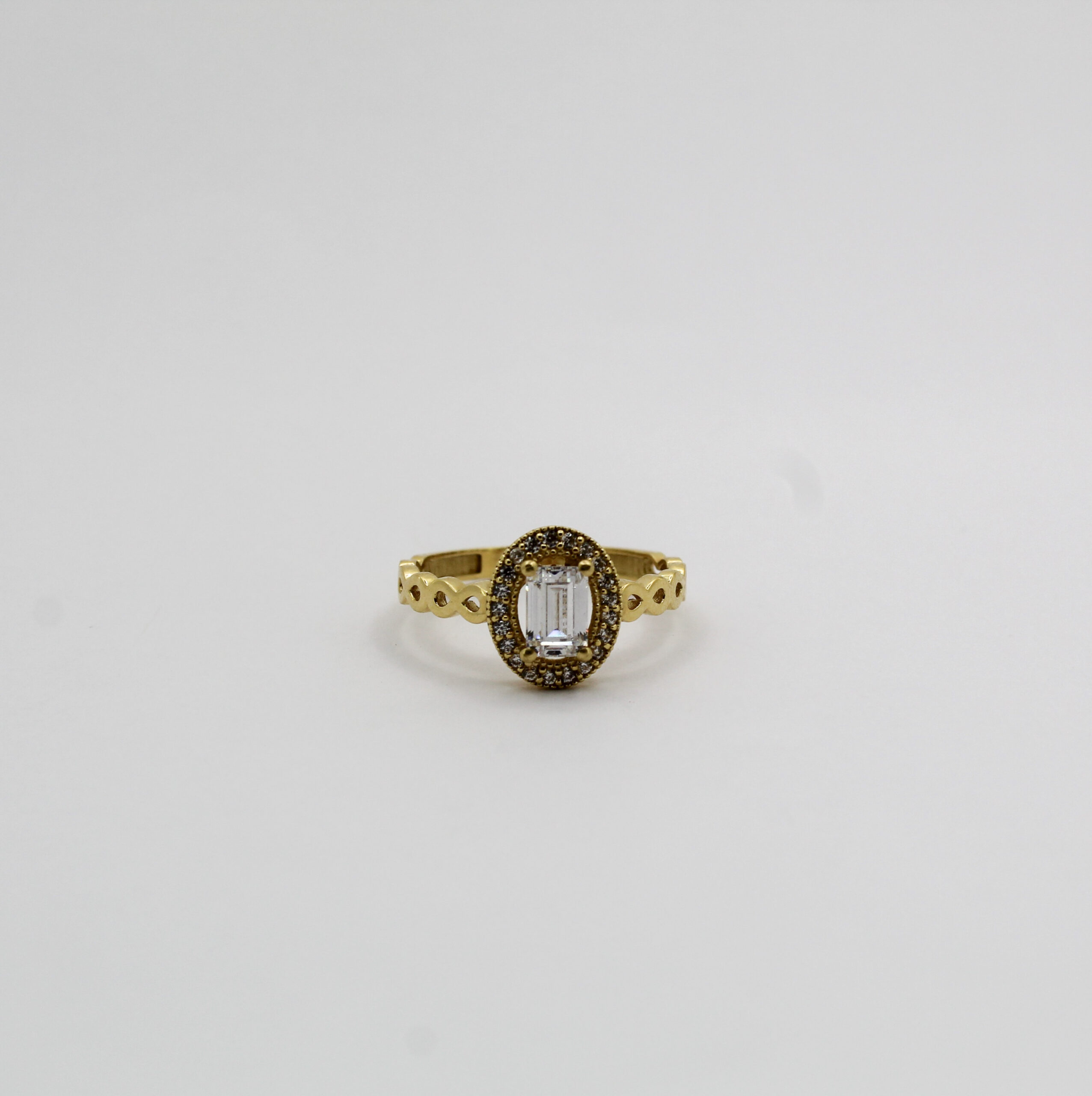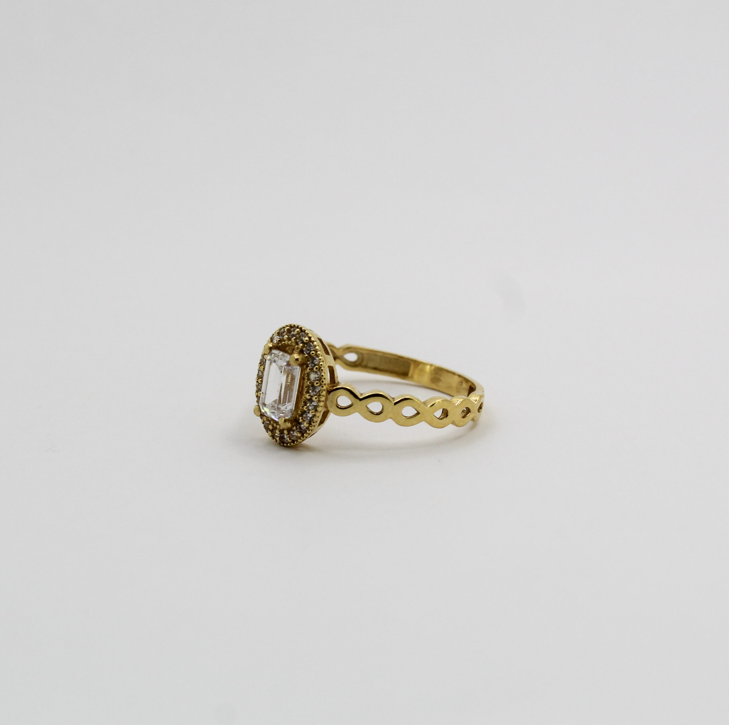 يتميز الخاتم بحجر مستطيل متألق يلتقط الضوء ببريق ساحر، محاط بإطار بيضاوي مرصع بأحجار كريمة صغيرة غُرست بدقة لتزيد من لمعانه وأناقة التصميم.