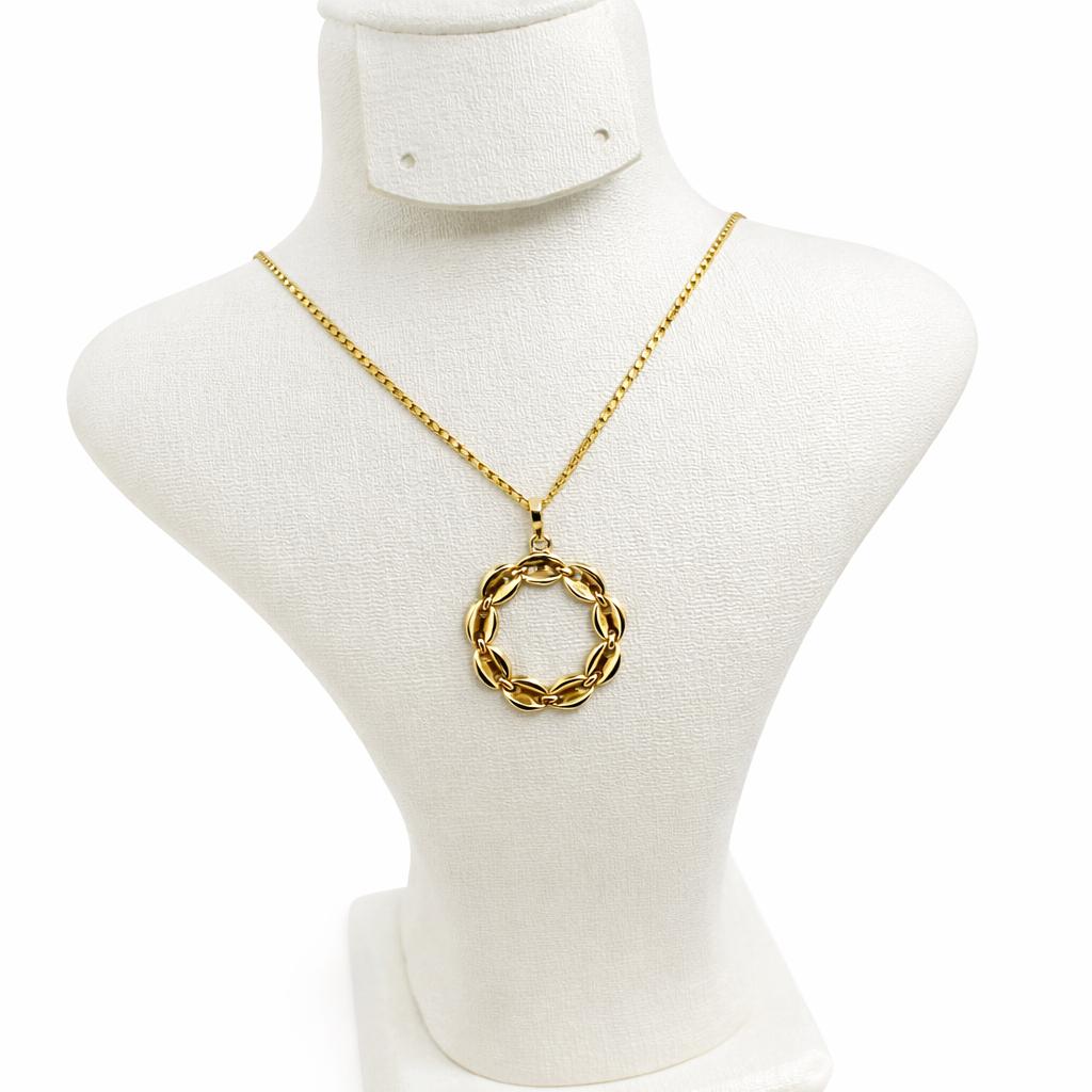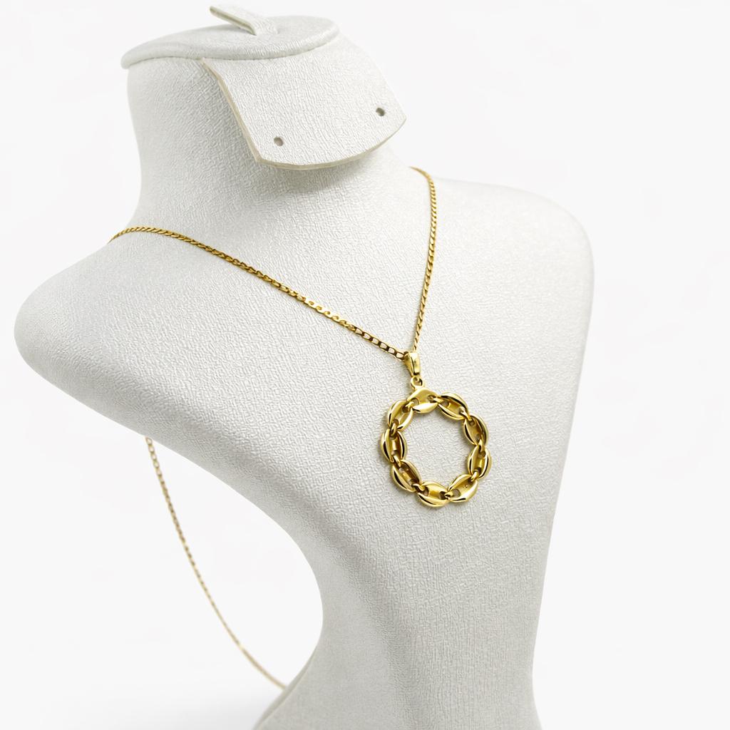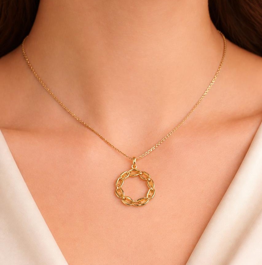 سلسلة من الذهب بتصميم أنيق وعصري، تتوسطها مدالية دائرية مكوّنة من حلقات متشابكة تمنحها مظهرًا راقيًا ومتناسقًا. يعكس التصميم توازنًا جميلًا بين البساطة والفخامة، ليبرز الحرفية العالية في أدق التفاصيل.