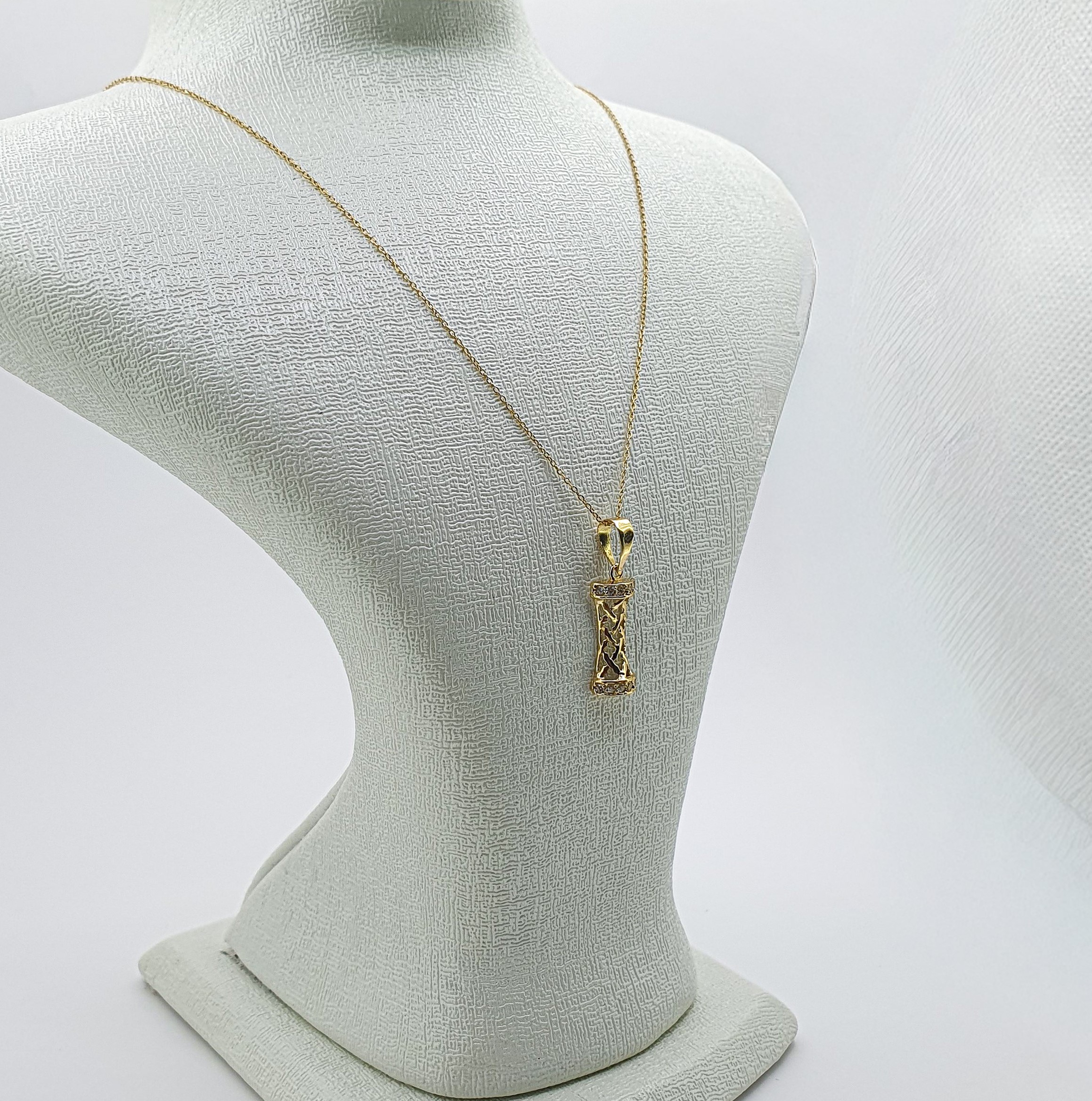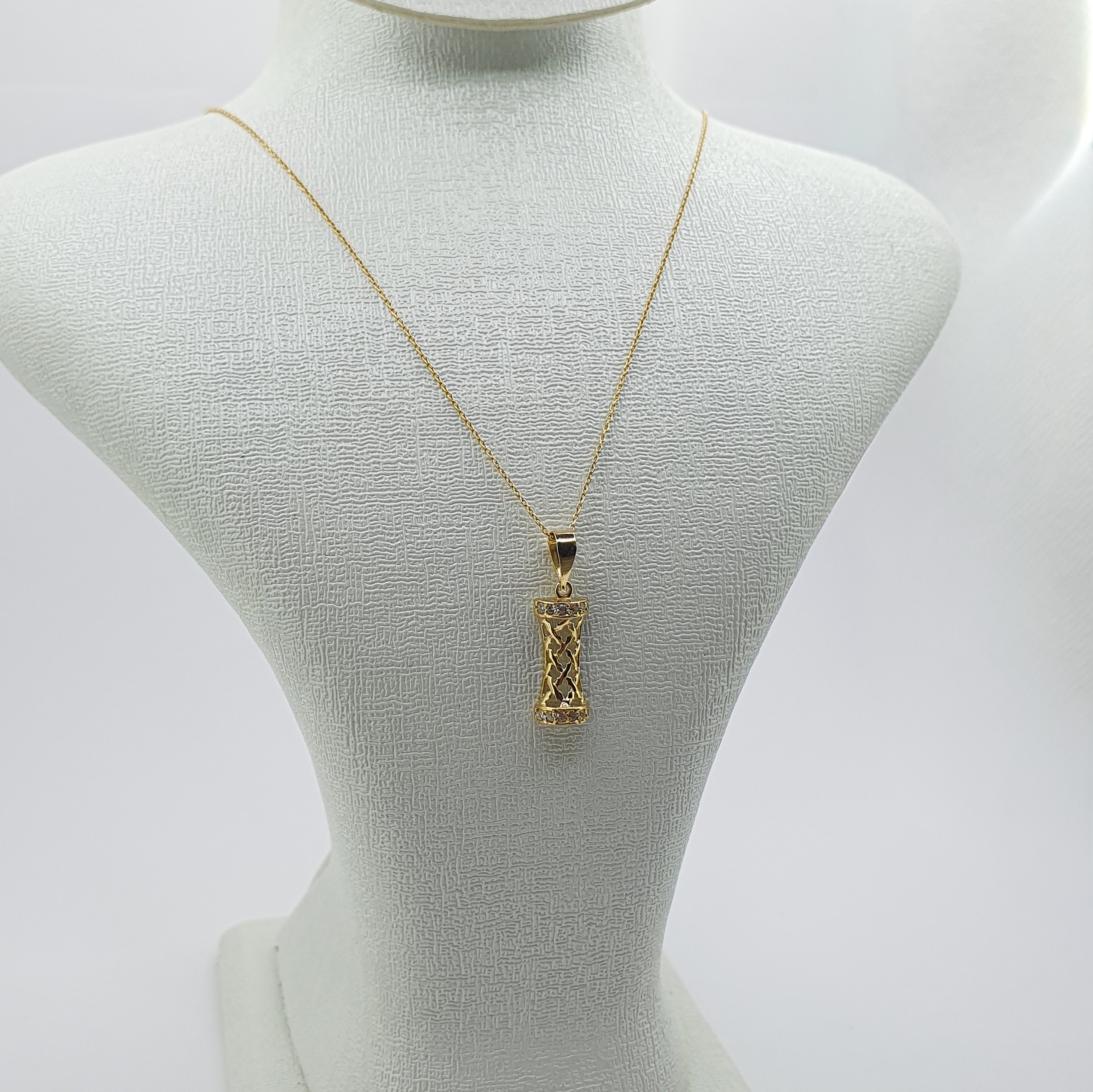 التصميم و الشكل : تتميز هذه القلادة بتعليقة عمودية على شكل ساعة رملية أو أسطوانة من الذهب، يغطيها تصميم مُشَبّك متقاطع يذكر بفن المشربية