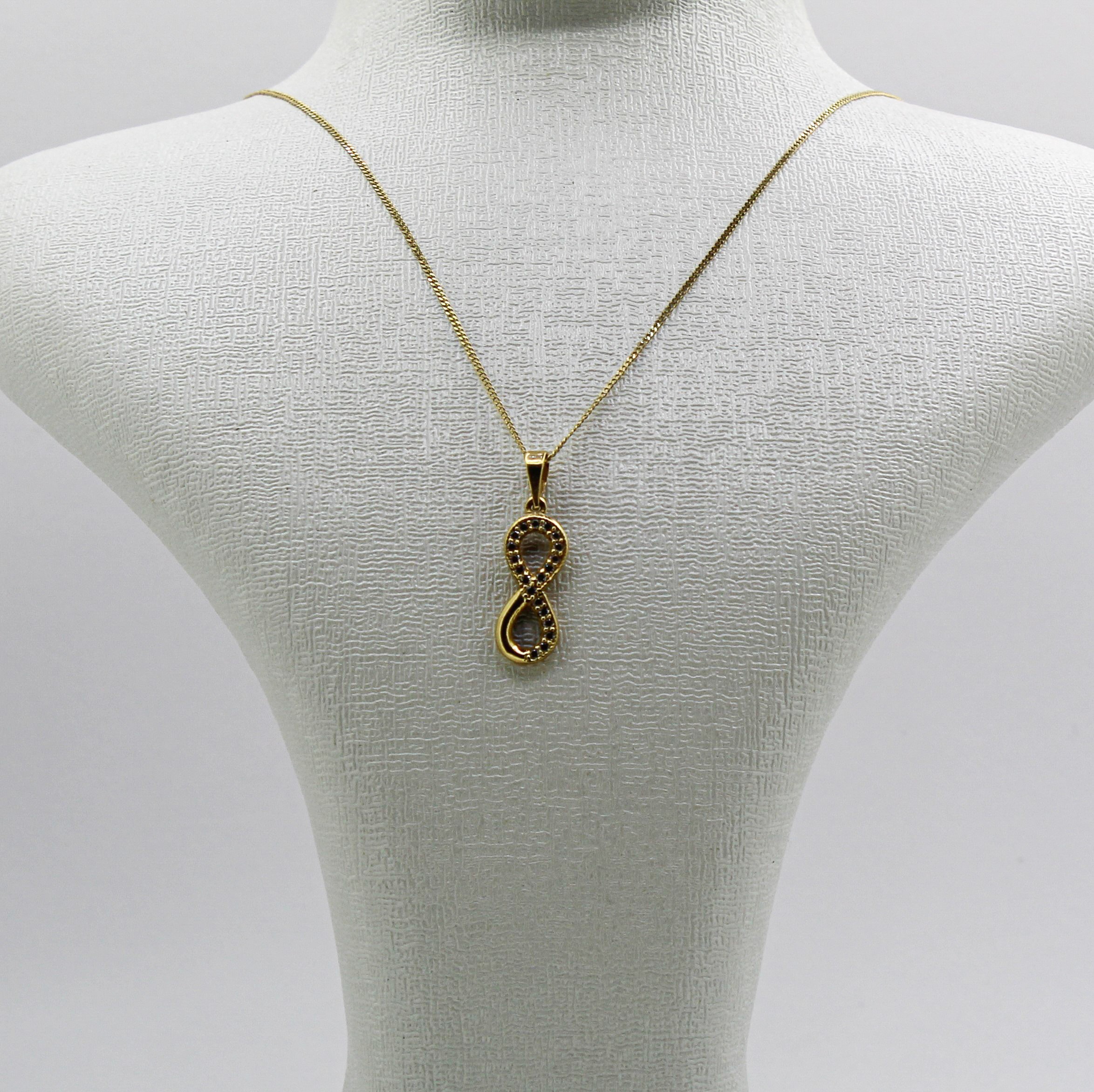التصميم و الشكل : تصميم ساحر يجسد رمز “اللانهاية” (Infinity)، يعكس أرقى معايير الرومانسية والأناقة الخالدة. هذه القلادة الذهبية هي تحفة فنية مصغرة، حيث تم صقل منحنيات رمز اللانهاية بدقة فائقة ليحتضن الأحجار الكريستالية اللامعة، مما يخلق قطعة تنبض بالضوء وتعكس الجمال الأبدي لإطلالتك