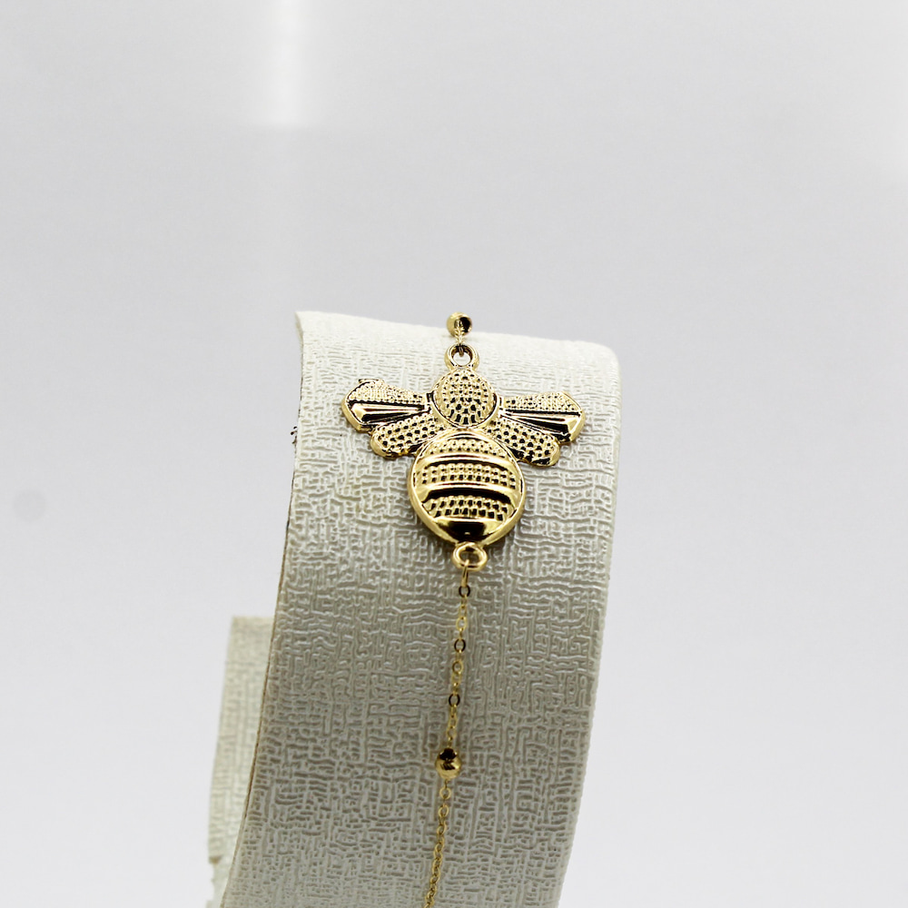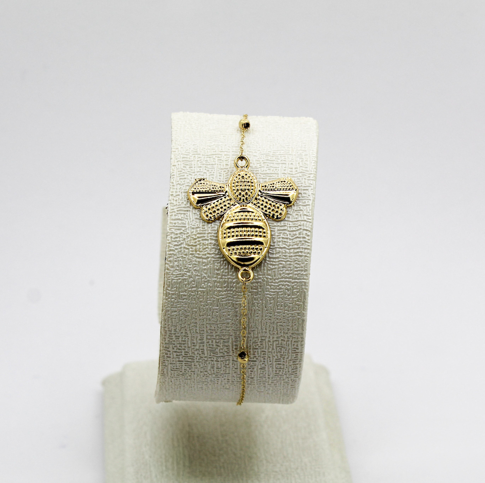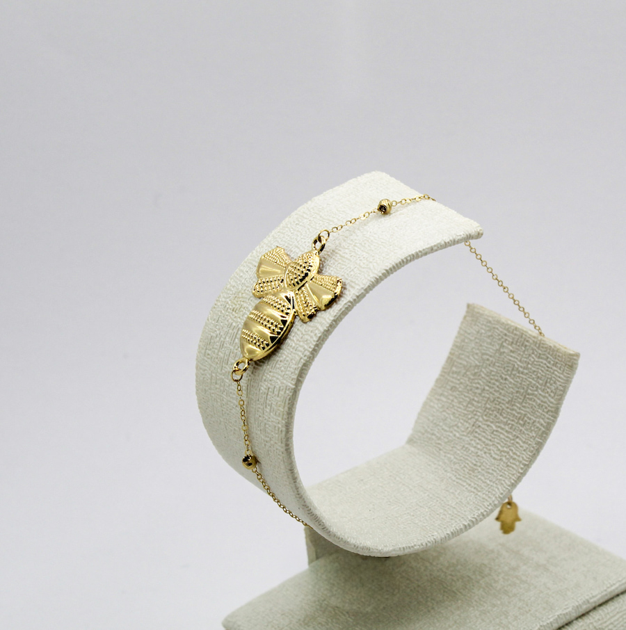 التصميم و الشكل : يتدلى تصميم النحلة من سلسلة رقيقة، وتتميز بنهاية ناعمة مزينة بكرات ذهبية صغيرة، مما يضيف حركة ولفتة أنثوية ساحرة إلى معصمك.