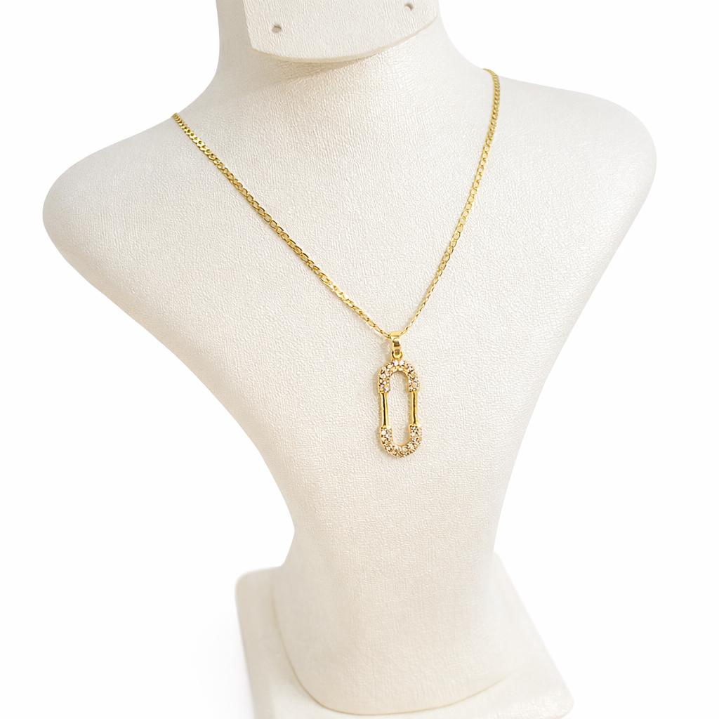 سلسلة Glowy من الذهب بتصميم عصري وأنيق، تتوسطها قلادة راقية مرصّعة بفصوص لامعة تضفي إشراقة جذابة. يعكس التصميم توازنًا جميلًا بين الحداثة والبساطة مع لمسة فخامة ناعمة.